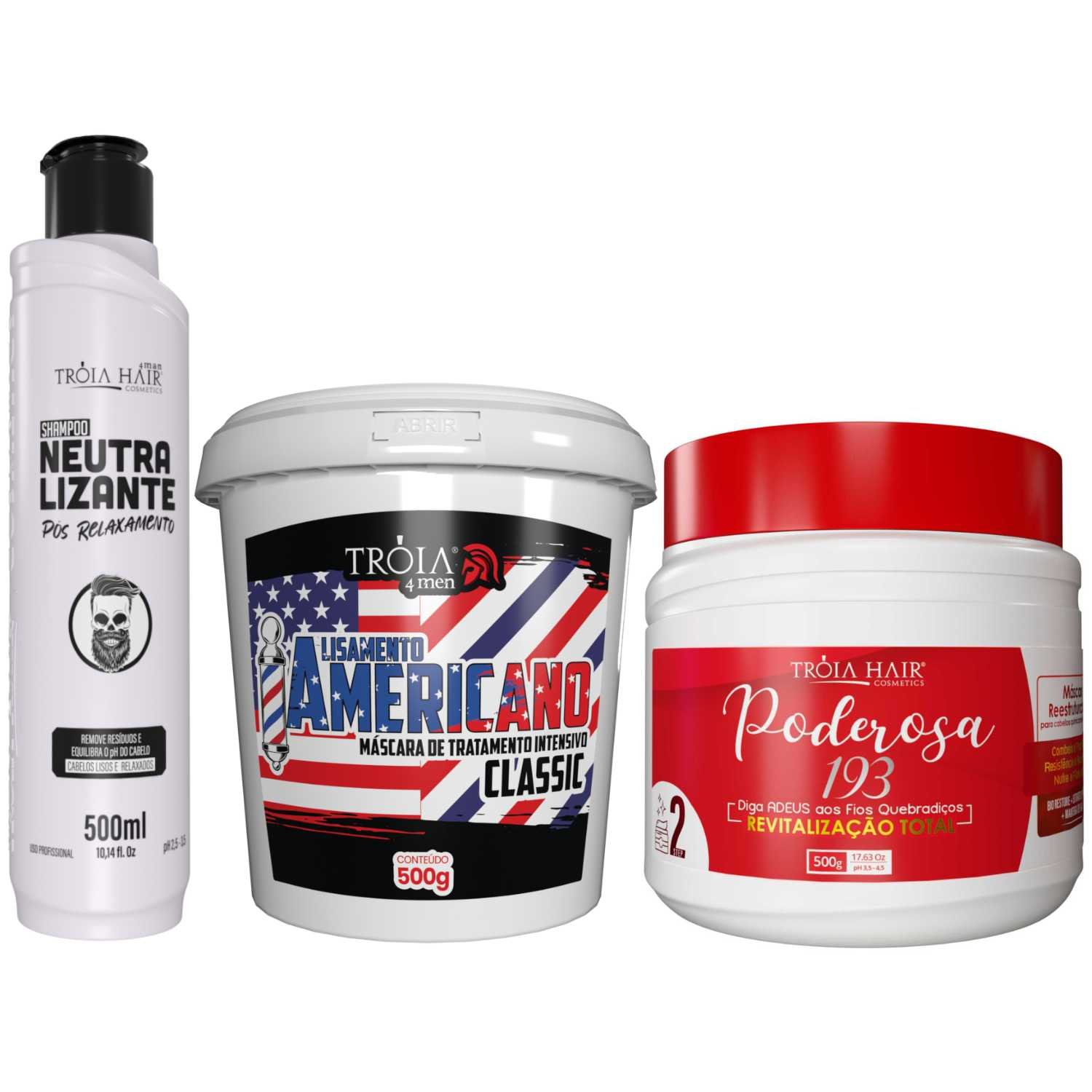 KIT ALISAMENTO AMERICANO CLASSIC + SHAMPOO NEUTRALIZANTE + MÁSCARA PODEROSA – TRÓIA HAIR 4MAN